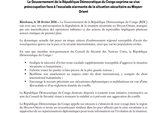 Le gouvernement de la République démocratique du Congo (RDC) a publié, ce samedi 28 février un communiqué officiel exprimant sa « vive préoccupation » face à l’escalade jugée « alarmante » de la situation sécuritaire au Moyen-Orient.
