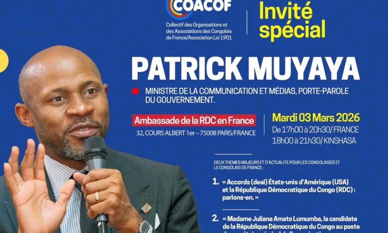 L’Ambassade de la République démocratique du Congo en France accueille ce jour à 17h00 une rencontre entre le ministre de la Communication et des Médias, Patrick Muyaya Katembwe, et les Congolaises et Congolais établis en France.Cette séance d’échanges portera sur deux thématiques majeures de l’actualité nationale et internationale. D’abord, les accords conclus entre les États-Unis et la République démocratique du Congo, au cœur des débats publics ces dernières semaines. Le ministre entend apporter des éclaircissements et répondre aux interrogations de la diaspora sur la portée et les implications de ces engagements bilatéraux.Ensuite, la rencontre abordera la candidature de Juliana Amato Lumumba au poste de Secrétaire générale de l’Organisation internationale de la Francophonie (OIF). L’objectif est de mobiliser et fédérer la diaspora Les membres de la communauté congolaise de France sont ainsi invités à prendre part à cet échange citoyen.