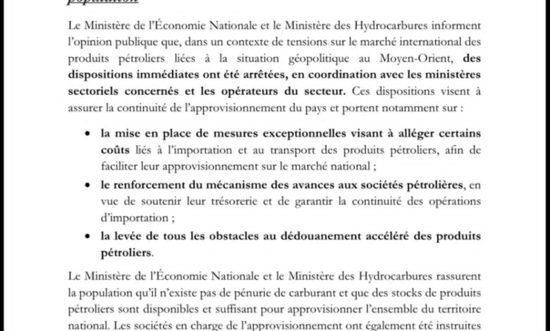 Dans ce même communiqué conjoint, les Ministères de l’Économie Nationale et des Hydrocarbures ont tenu à rassurer la population :
